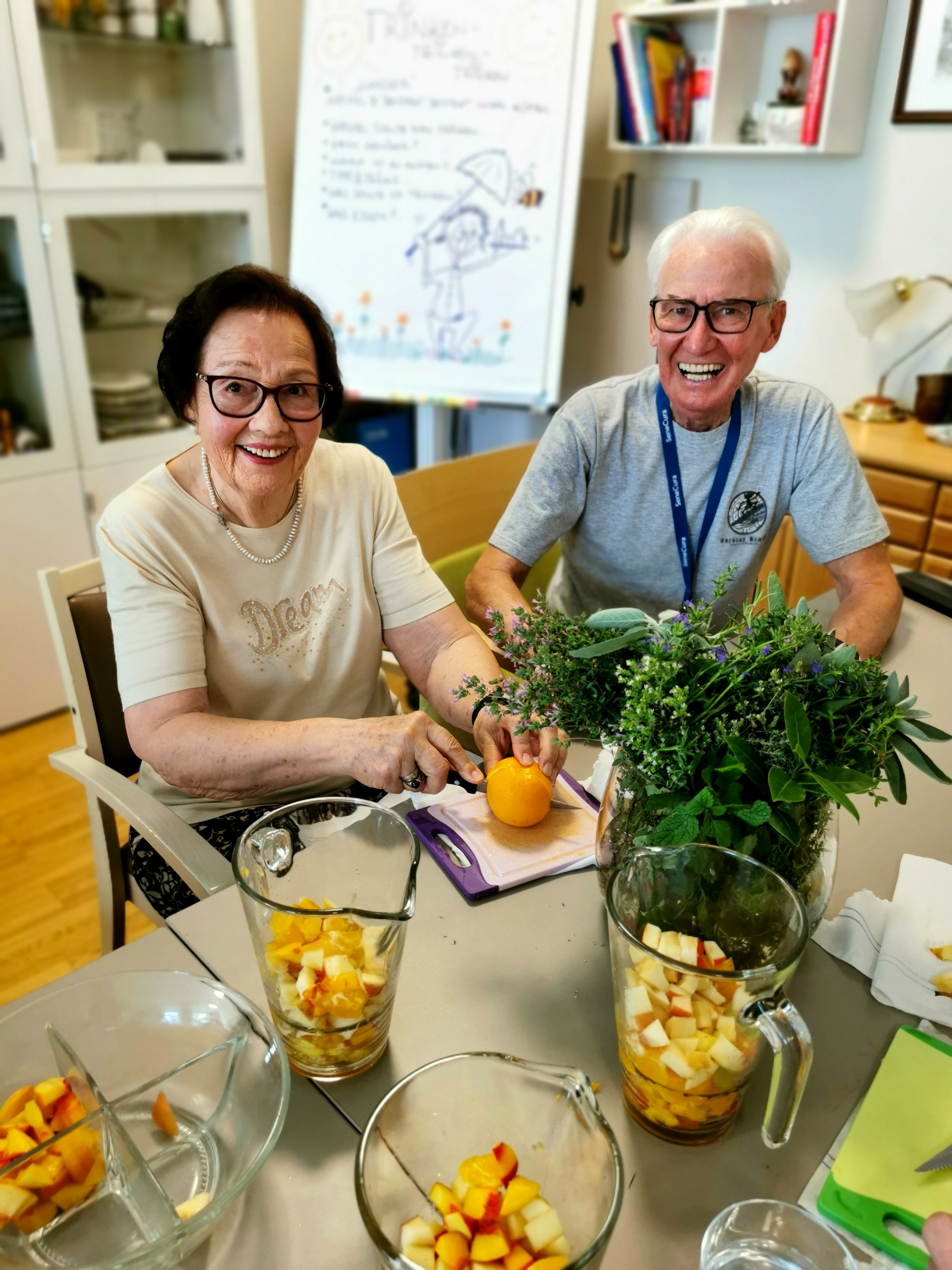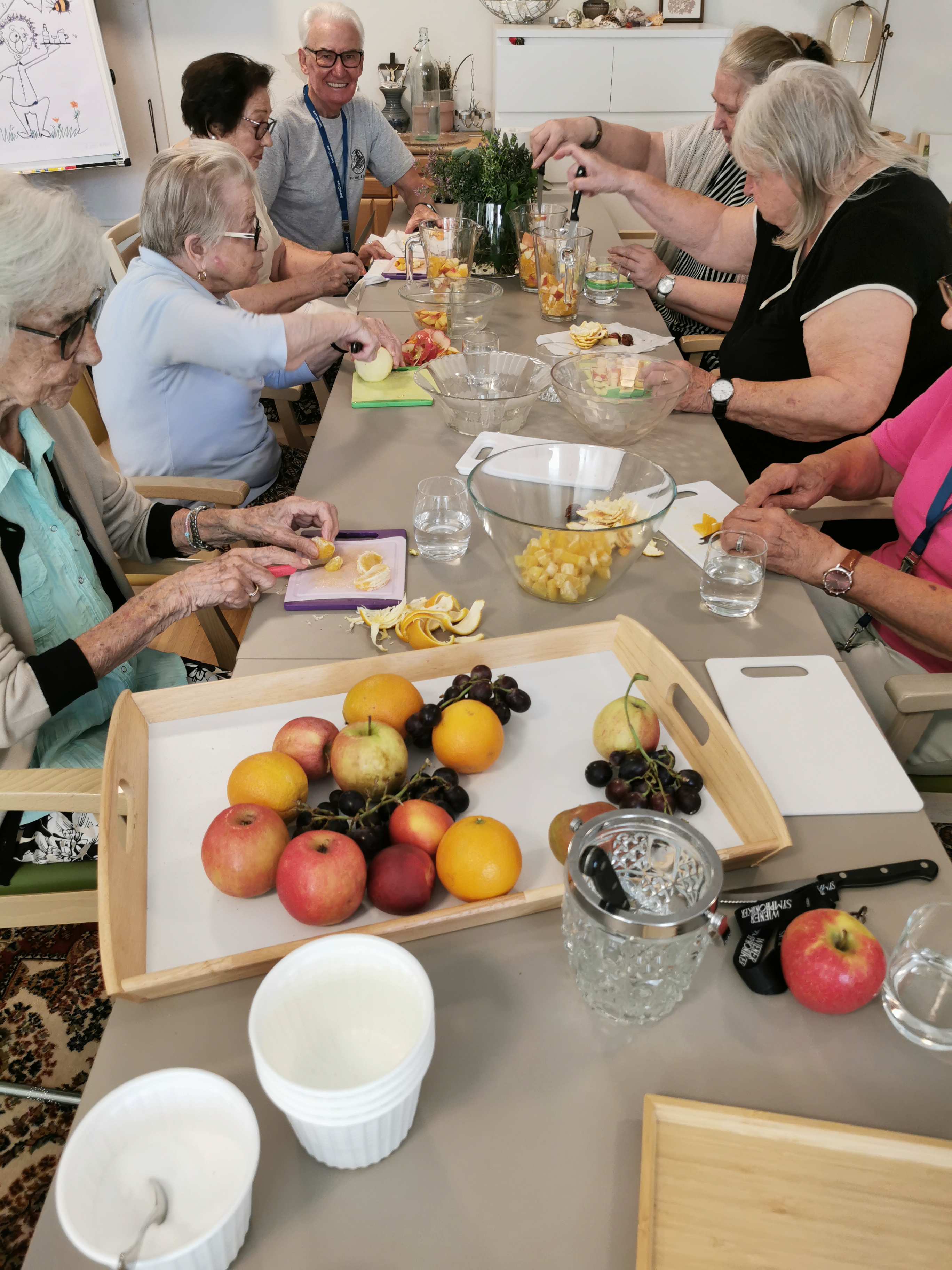 Frisches Obst gehört auf den täglichen Speiseplan der Damen und Herren der SeneCura BePartments Graz-Lend. Kürzlich wurden gemeinsam frische Äpfel, Nektarinen, Orangen und vieles mehr geschnitten und für Säfte verwendet oder mit Joghurt oder auch pur genossen. Das Ehepaar Aichernig ist begeistert: „Wir sind noch nicht so lange in den BePartments, aber was hier geboten wird ist sensationell. Heute haben wir frisches Obst genossen und auch verschiedene Kräutersalze hergestellt. Wir sind so froh, so herzlich aufgenommen worden zu sein. Vielen Dank.“