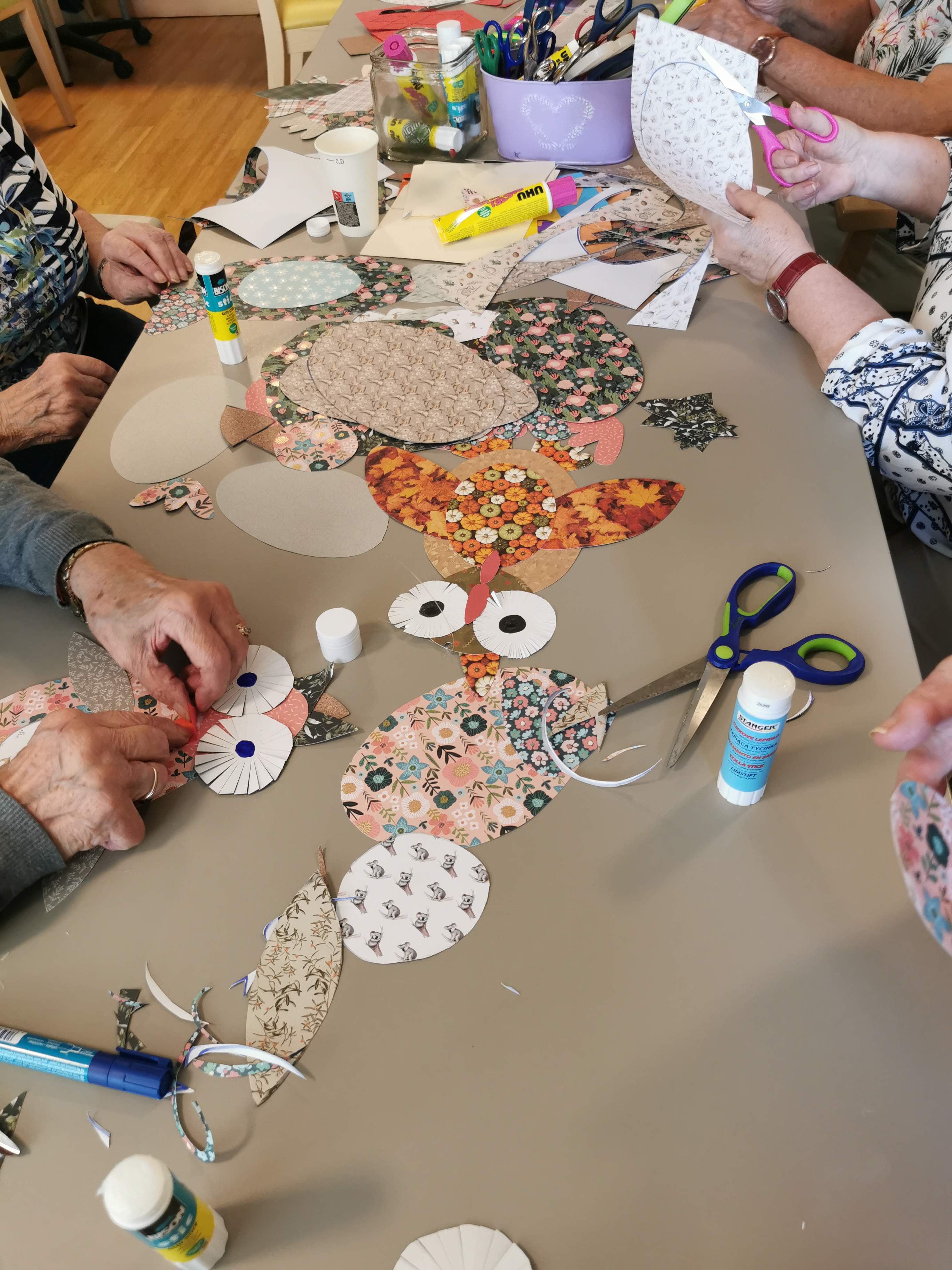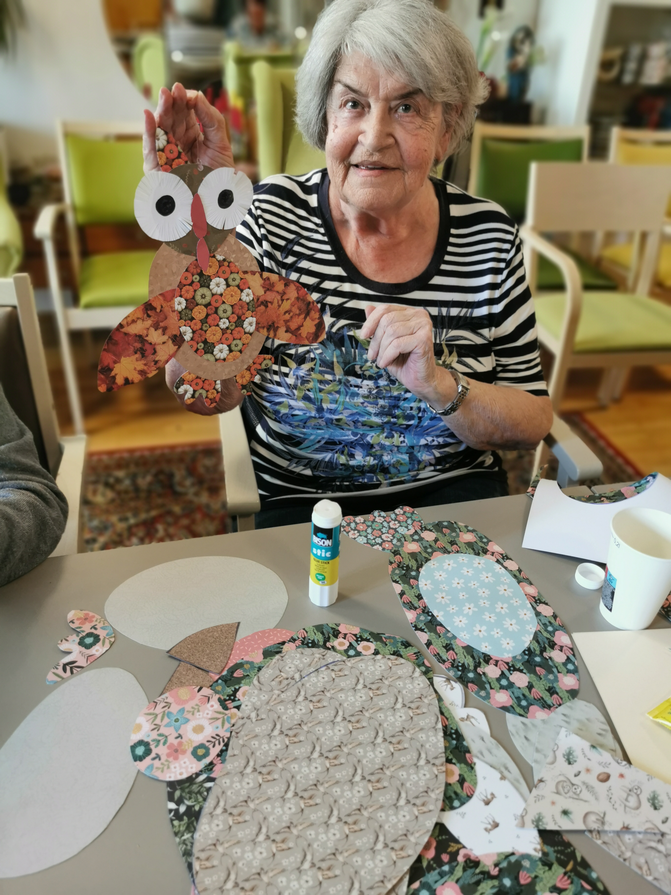 Die Hände der Damen und Herren des SeneCura BePartments Graz-Lend ruhen wenig. Immer ist etwas los und diesmal gestalteten die Teilnehmer:innen lustige Eulen zum Thema Herbst. Der Aktivitätenleiter, Siegfried Rumpold, war begeistert von den individuellen Kunstwerke und ließ es sich nicht nehmen. Die Herbsteulen mit den Bewohner:innen im Haus zu verteilen. So können die künstlerischen Werke der Seniorinnen und Senioren noch lange bestaunt werden! Die Bewohner:innen und auch der Aktivitätenleiter hatten so einiges an Spaß beim diesjährigen kreativen Herbstbasteln.